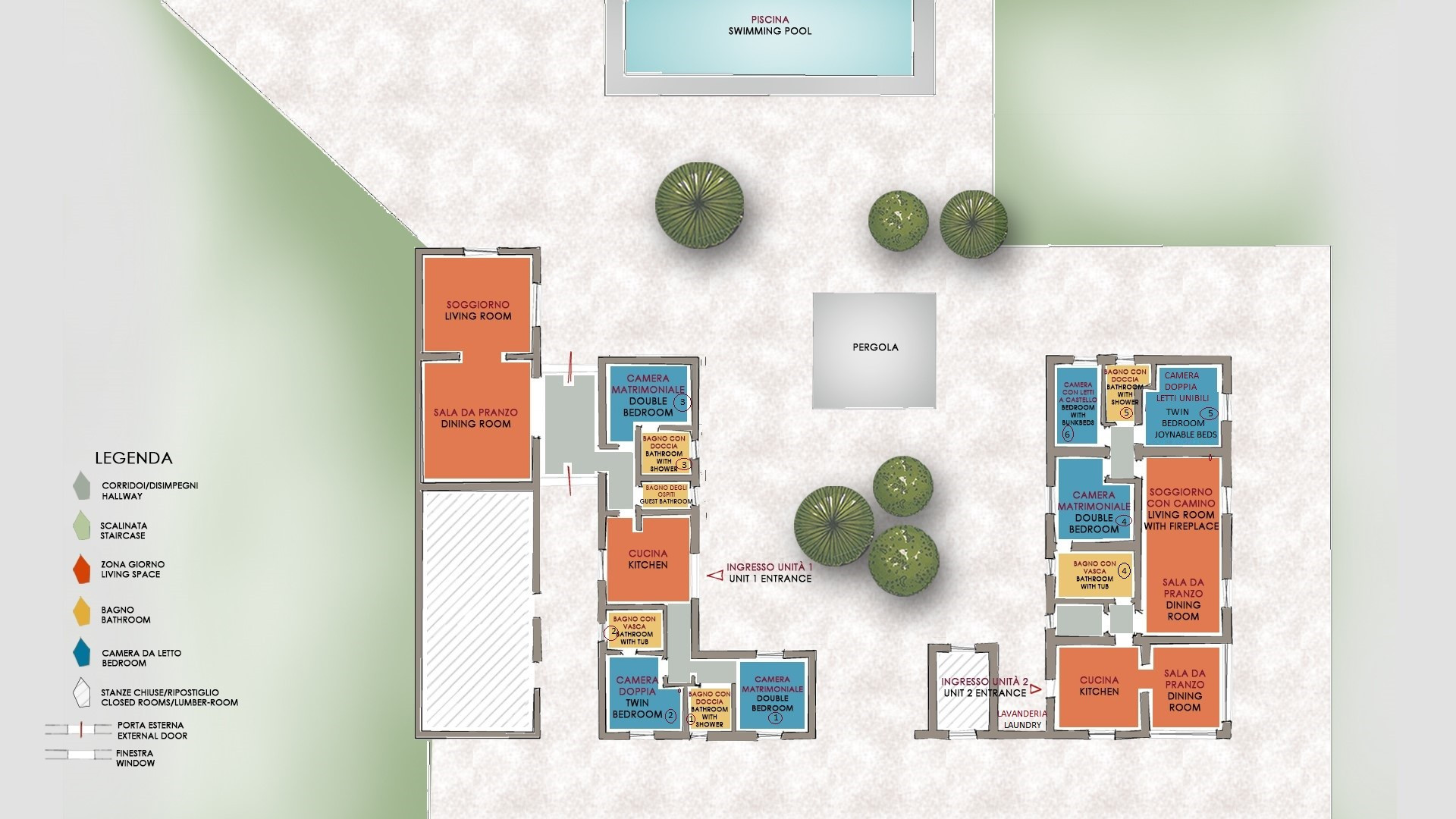 The single-floor villa has a total area of 350 sq m, and is composed of two independent units separated by a fully-equipped courtyard. UNIT 1: The main entrance leads to the kitchen built in typical Sicilian style. The kitchen is connected, on one side, to a hallway with double bedroom with en-suite bathroom with shower and twin bedroom (with joinable beds) with en-suite bathroom with tub, and, on the other side, to a guest bathroom and a double bedroom with en-suite bathroom with shower. The floor is completed by a large living room consisting of a dining area with a table for 12 people and a lounge area with satellite TV. From here large French windows open onto the outdoor space with dining area and kitchen. UNIT 2: It is accessed through a small atrium from the outside (where access to the laundry room is also located) which leads directly into the kitchen, well connected to the dining room and living room consisting of a further dining area and lounge with fireplace and satellite TV. The large French windows open onto the panoramic terrace facing the sea. The sleeping area is composed of a double bedroom and a bedroom with bunk beds, sharing a bathroom with shower, and a double bedroom with en-suite bathroom with tub. This latter has a double entrance and is also accessible from the living area.