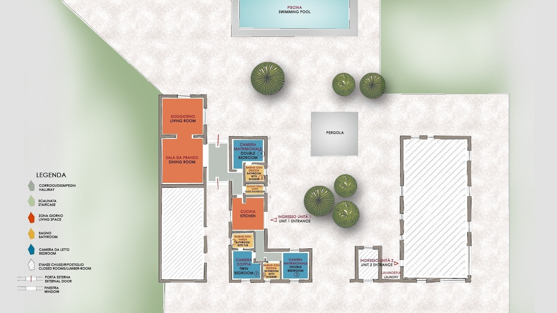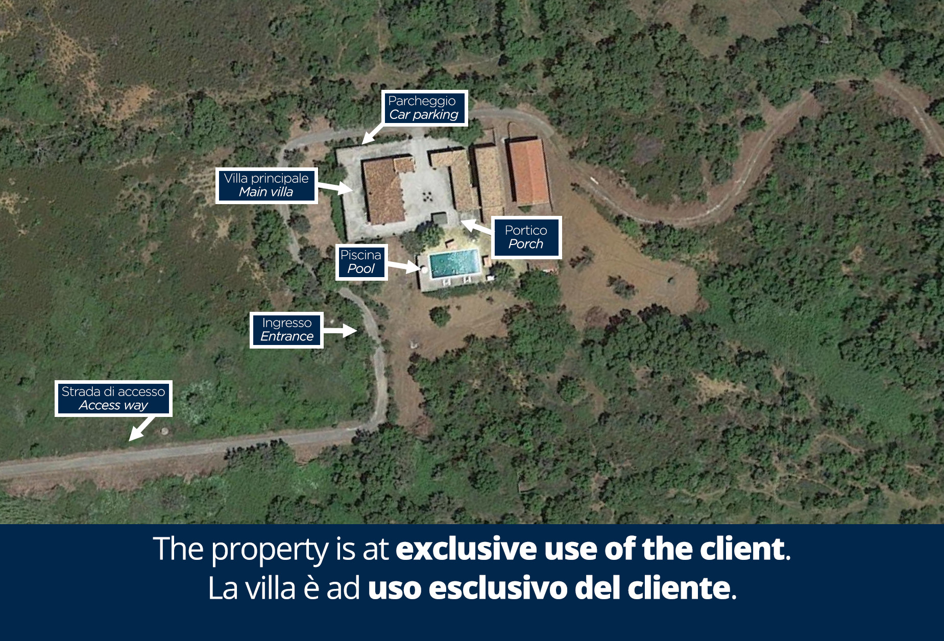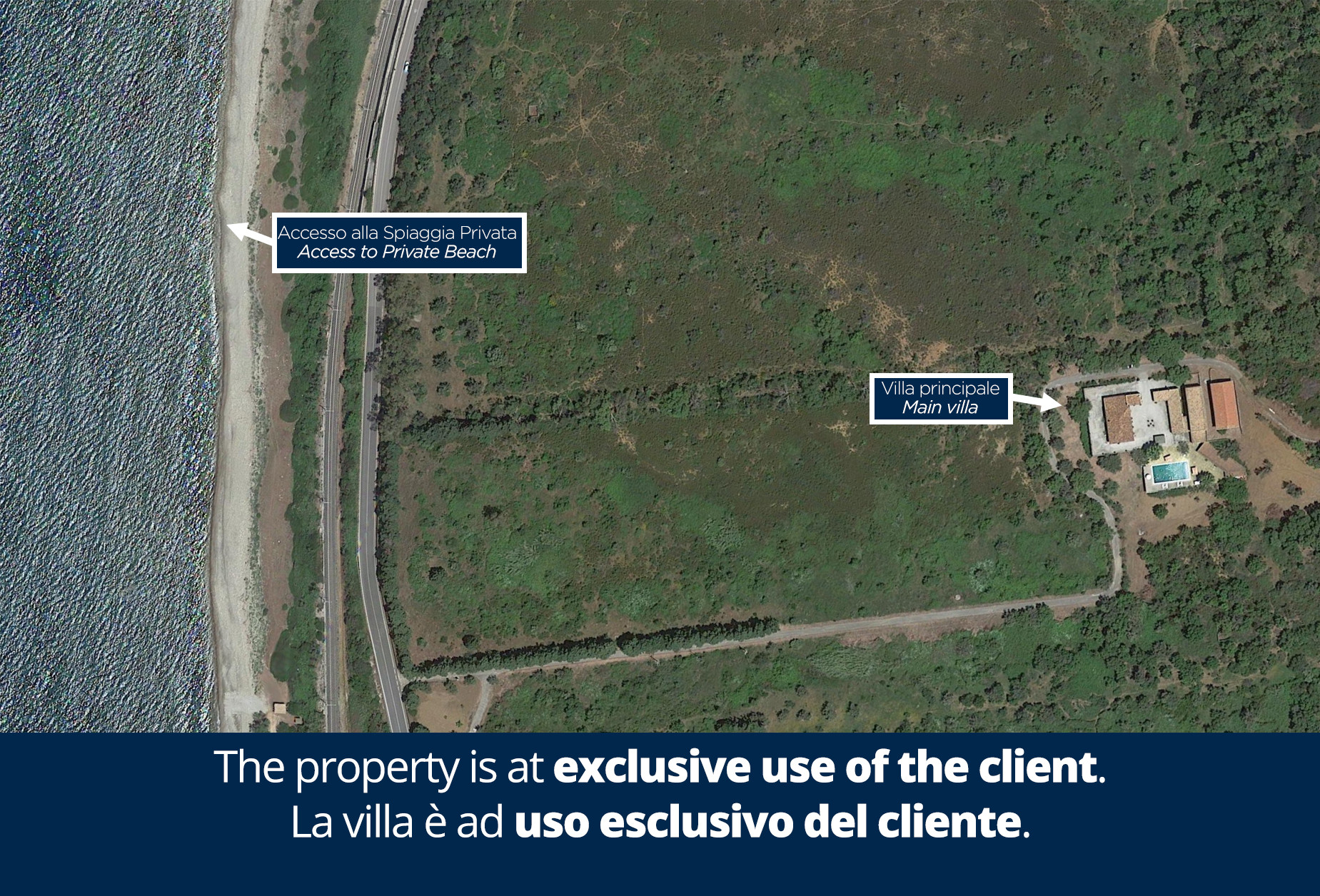 The property, enclosed by a 1 m-high barbed wire fence, extends over 15 hectares including a wood with a lake. A path of about 400 m leads to the private pebble beach, typical of the area. On the beach is a small hut with deckchairs available for guests. Here, even in the hottest months, guests can sunbathe and swim undisturbed. Surrounding the two residential units is a large paved area with central courtyard equipped with a gazebo with relaxation area. About 10 m from the house and the swimming pool is a large pergola providing shade to a large dining table for 12 people and a kitchen complete with brick-built barbecue and wood oven. The property is equipped with an entrance gate and a 5-car parking area.