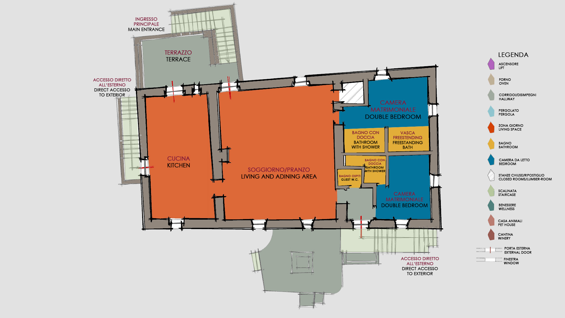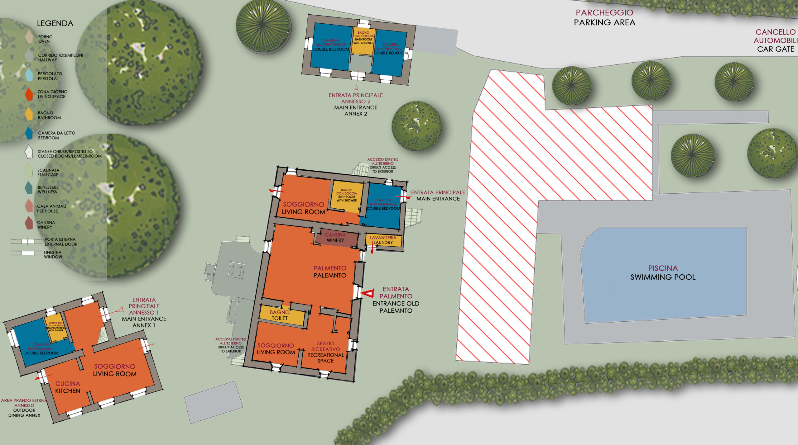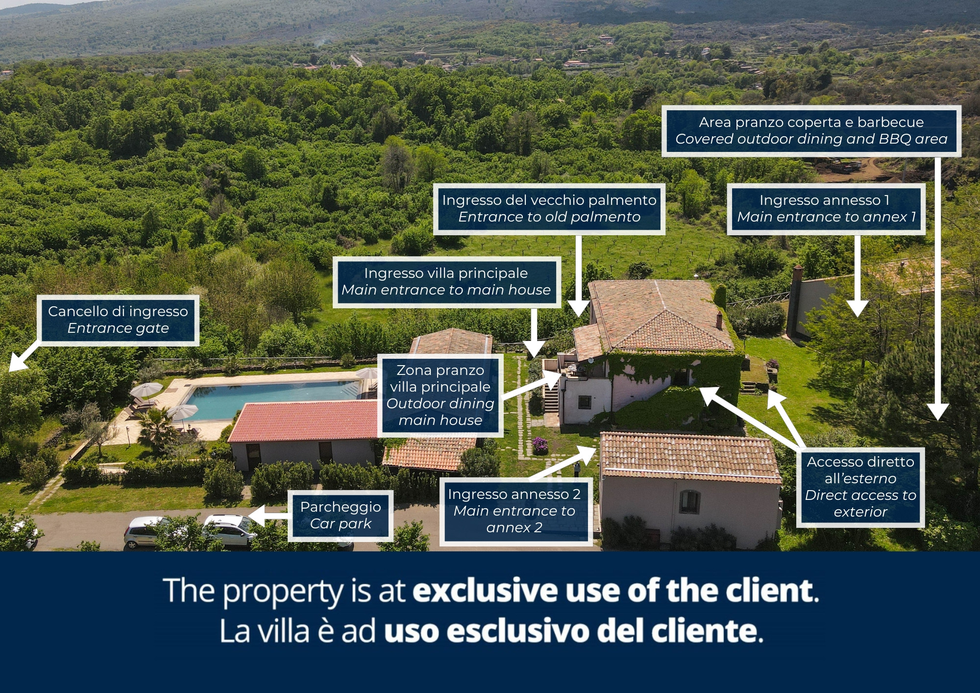 The complex consists of three separate buildings about 30 m away from each other. The MAIN HOUSE extends for approximately 250 sq m on two floors, connected by an external staircase. The main entrance is on the first floor, consisting of a large living room with a big sitting area with sofas and a dining area with an imposing table for 14 people. The large adjoining kitchen is fully equipped with a central island and a functioning fireplace next to two armchairs. The kitchen leads directly to the small outdoor terrace with a dining area for eight people. The floor is completed by two elegant double bedrooms with panoramic views of the volcano, both with open-plan ensuite bathrooms, one with tub and shower and the other with shower. Going down the external stairs you come to the ground floor where "Il Vecchio Palmento" is located. Once wine was produced here, now it has been renovated into a cellar where you can taste wines from the area, as well as that from Terre Normanne. There is also a living room with sofa and TV, and a guest bathroom. Also located on the same floor is the laundry area. On the other side of the external staircase is a double suite with double private entrance, sitting room and bathroom with shower and tub. A few steps away is ANNEX 1, the old farmhouse of about 150 sq m on two floors. The entrance on the ground floor leads to the living room with sofa and functioning fireplace. The well-equipped kitchen has direct access to the outdoor terrace, with a dining table for eight people, shaded by a canopy. The floor is completed by a double bedroom with ensuite bathroom with shower. A spiral staircase at the entrance leads to the upper floor with two double bedrooms: one with a small balcony and ensuite bathroom with hydromassage tub, the other with a private bathroom with shower. The floor is completed by a study. ANNEX 2, measuring approximately 40 sq m, consists of two double bedrooms, one with a queen size bed, sharing a bathroom with shower.