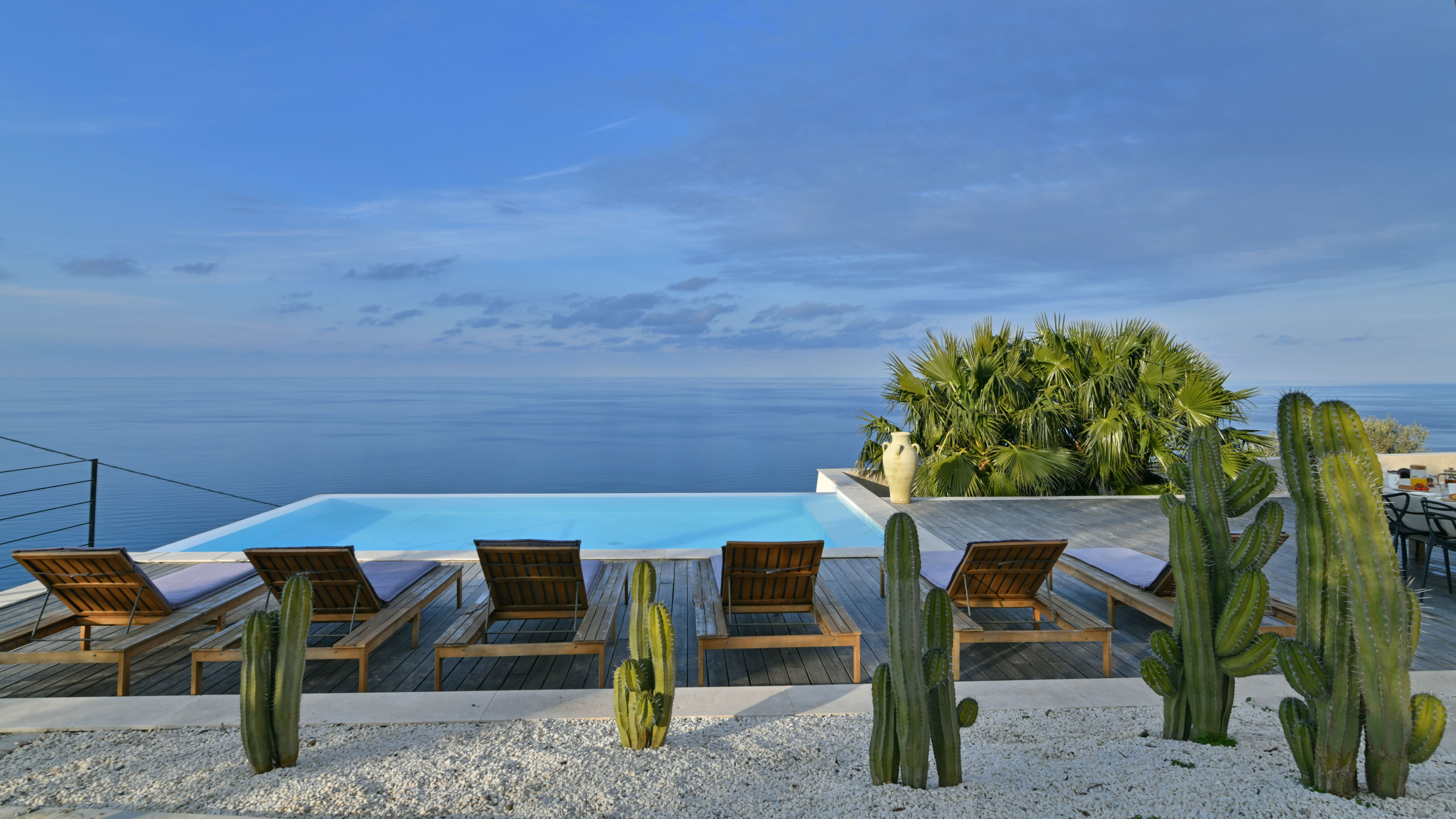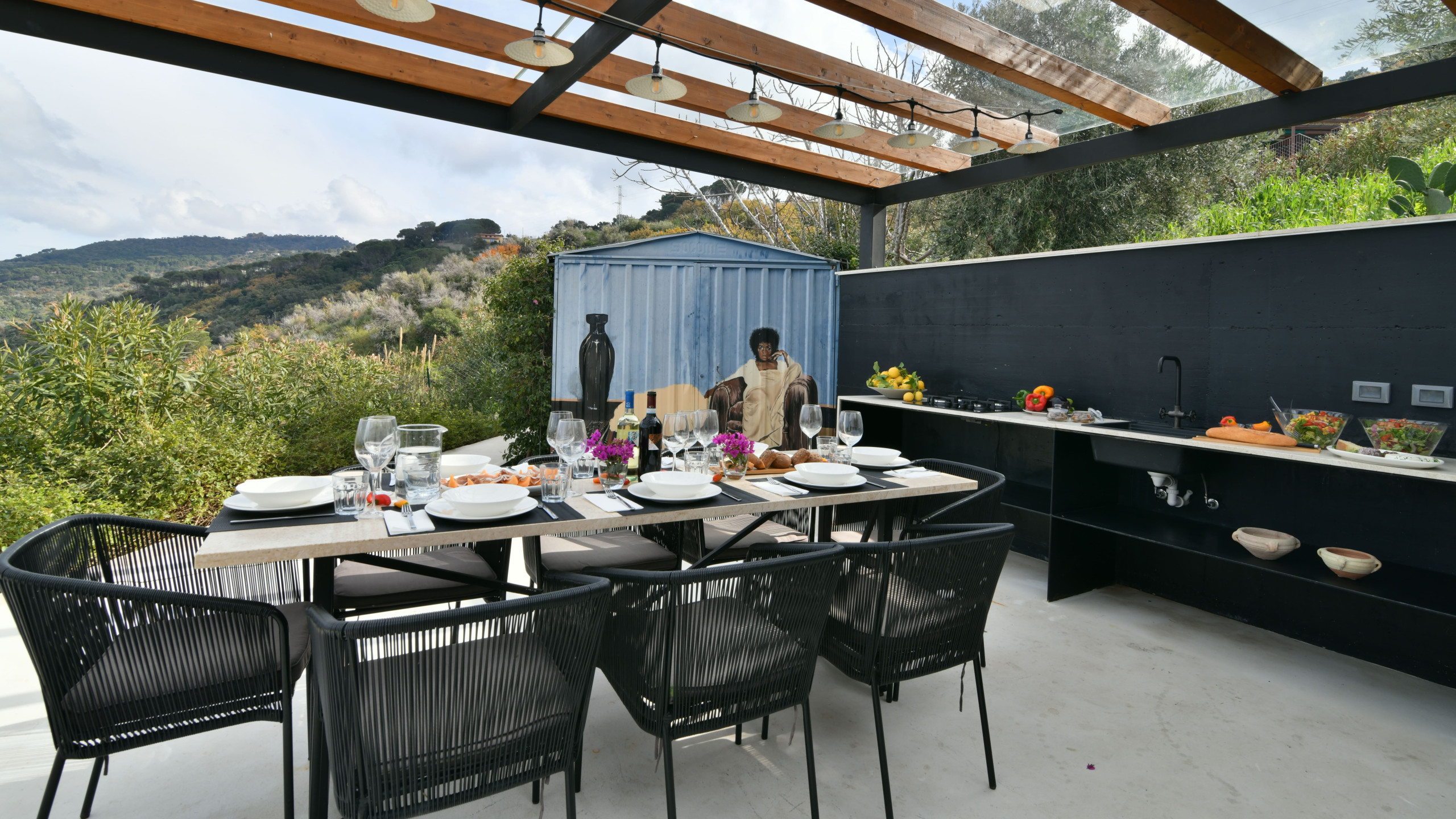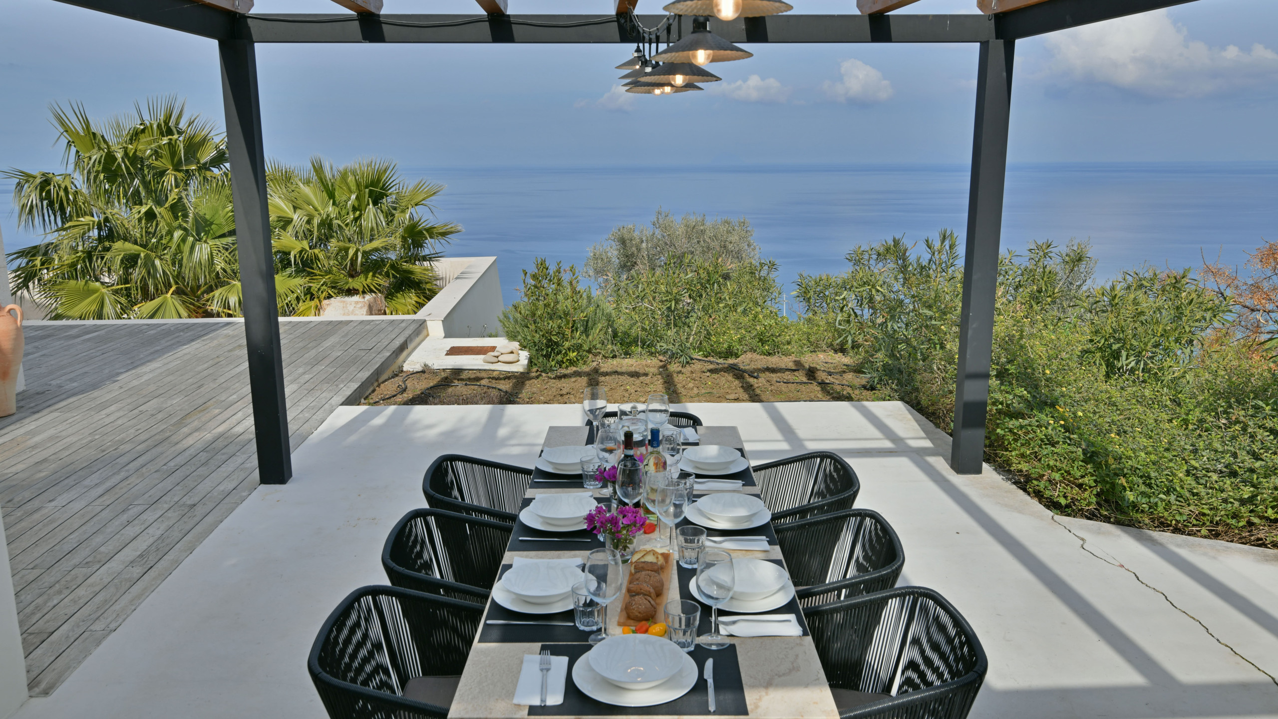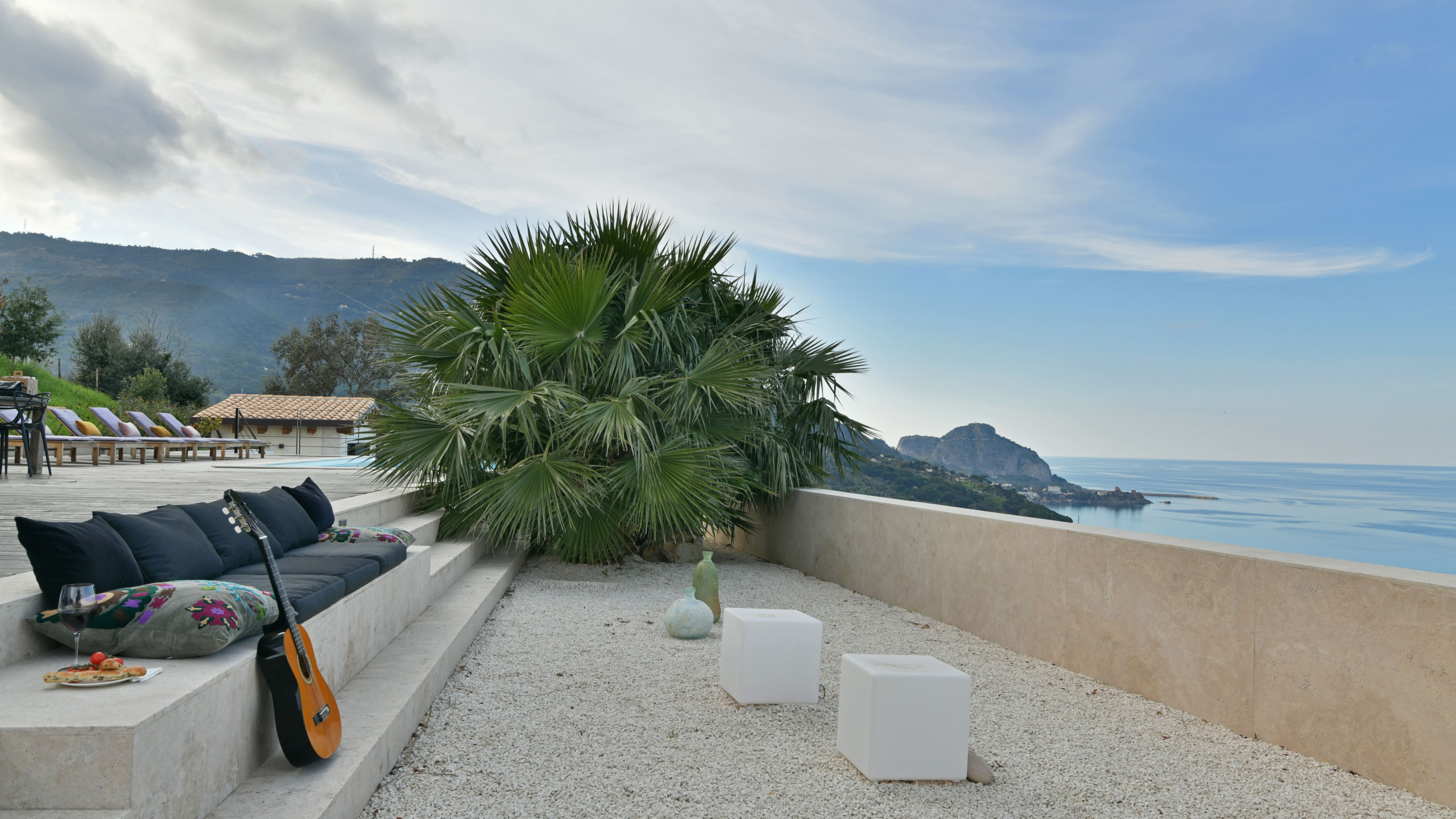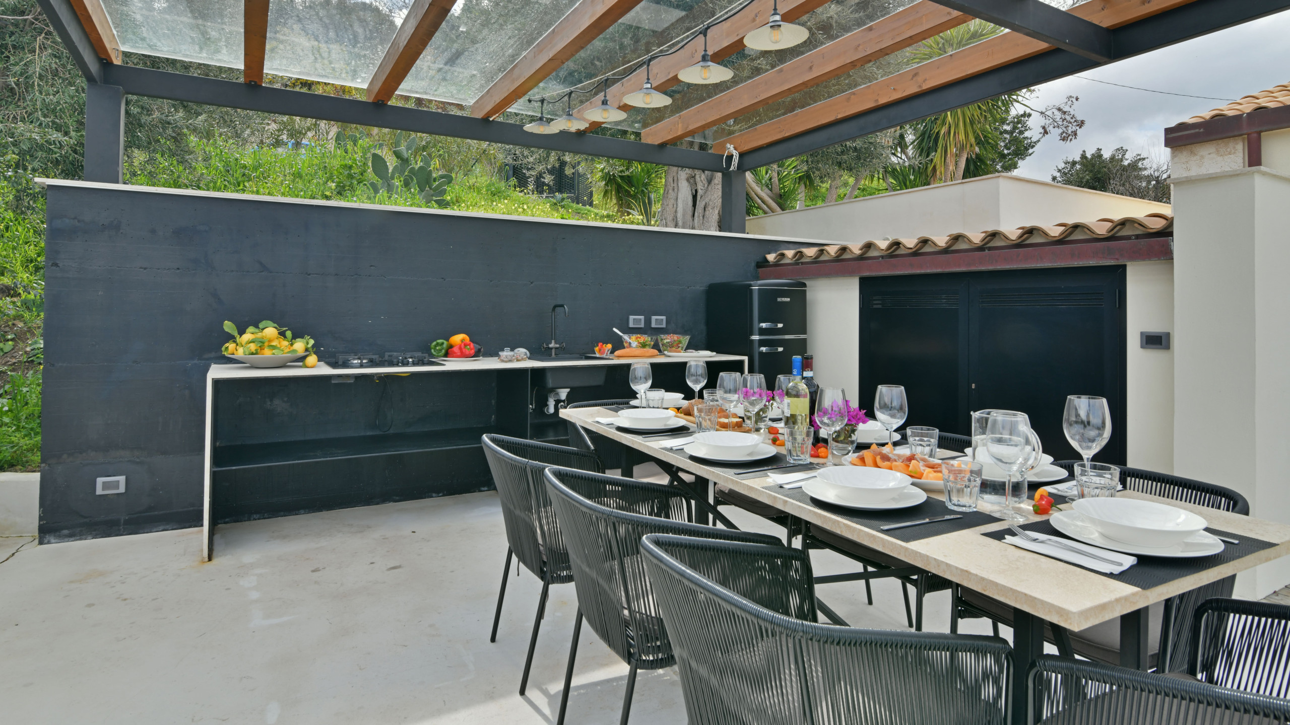 VILLA LUNA. Villa Luna is a chic, modern villa in a glorious hillside setting near Cefalu. An infinity pool, outdoor kitchen and large terrace set the scene for good times in the sun while incredible panoramic sea views add an unbeatable backdrop. Designed for easy summer living, Villa Luna is a dream home for those who love contemporary style and a coastal setting. The underfloor heating makes this villa an ideal winter retreat, a time of year that emphasizes the local authenticity freed of the summer confusion and when the colours of the sky are at their most intense. With three bedrooms and bathrooms in the main villa and a further double bedroom with a bathroom in an annexe, the villa can sleep up to eight guests comfortably. Step inside to an open, light-filled living space with the smooth grey floor, wooden beamed ceilings and stylish furnishings. Tall glass doors open out to a wide terrace with a cushioned, sunken sitting area on one side and shaded dining on the other. An inviting infinity pool is on hand for a refreshing swim. As you gather together for drinks and meals or take a quiet moment to unwind, the mesmerising seascape beyond is sure to enhance the mood.