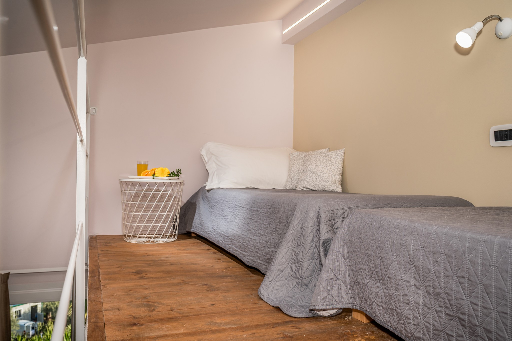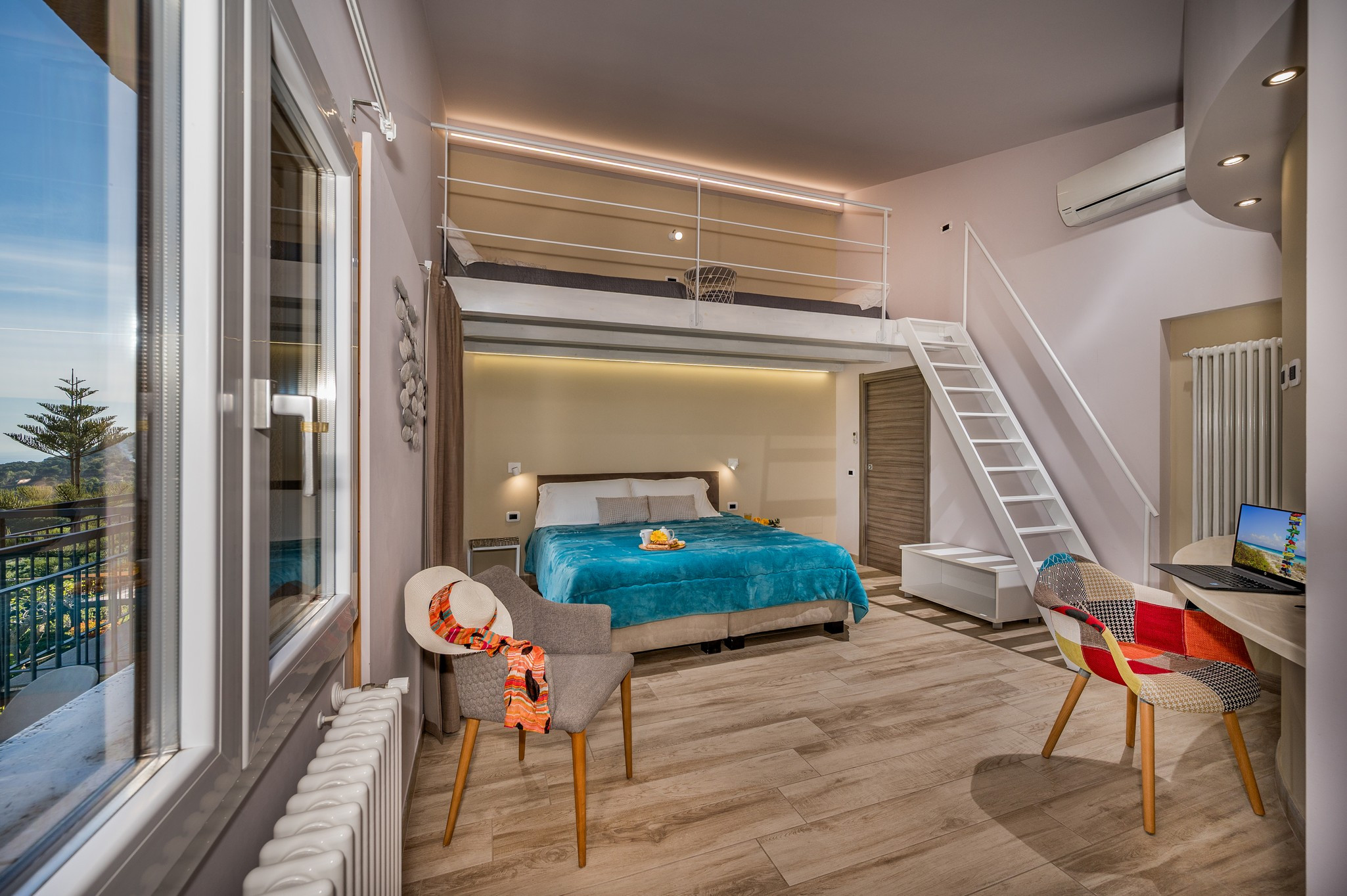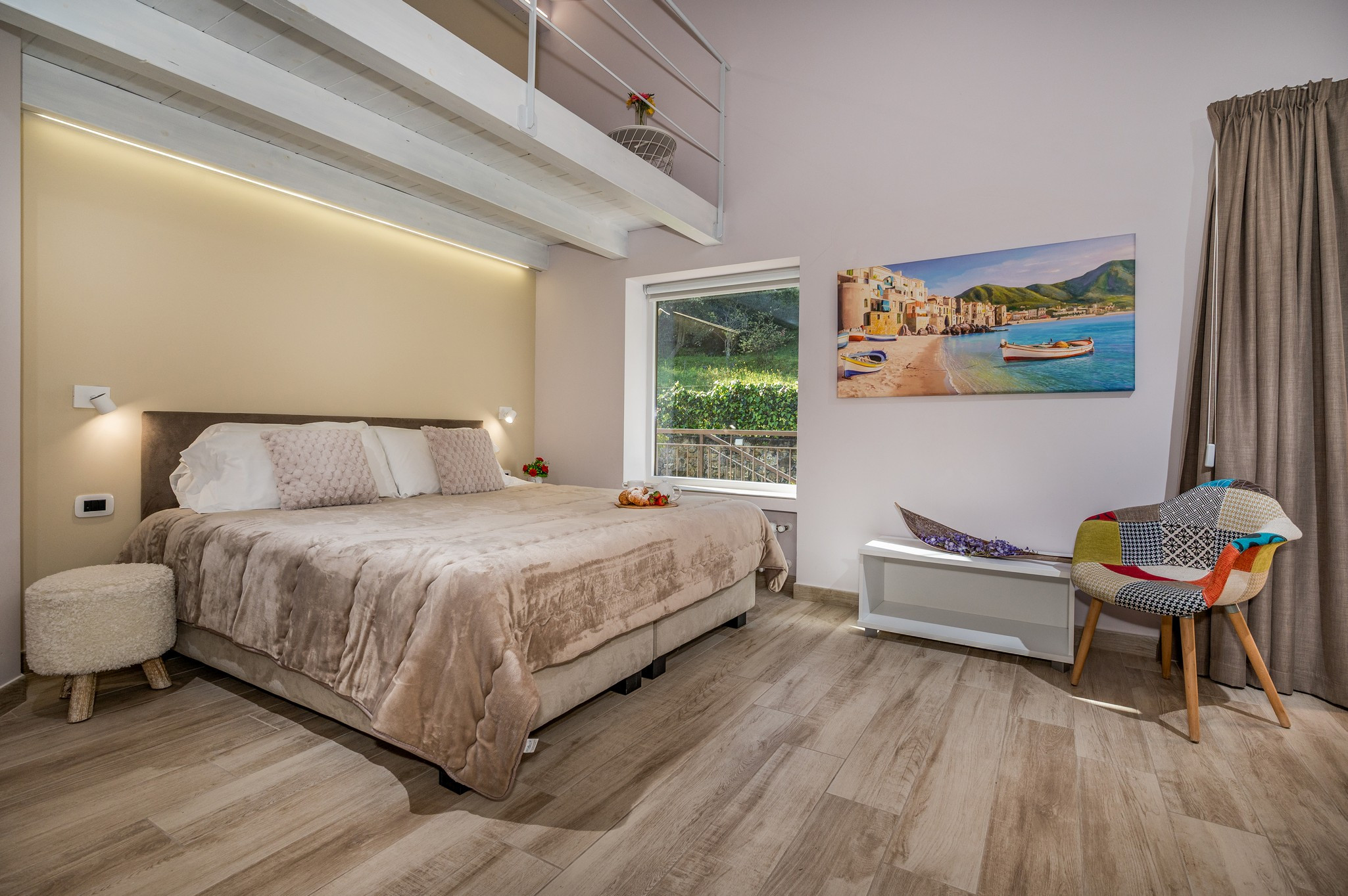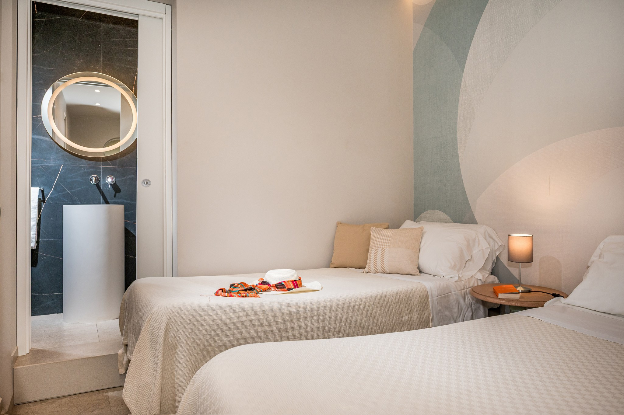 An exterior staircase leads to the newly renovated first floor, offering an airy living space that opens onto a large terrace with panoramic views of the pool, coastline, and Cefalù. This section of the villa has three double bedrooms, two of which feature mezzanines with two single beds, perfect for teenagers. Each bedroom has an en-suite bathroom, and all three double beds can be converted to twins upon request.