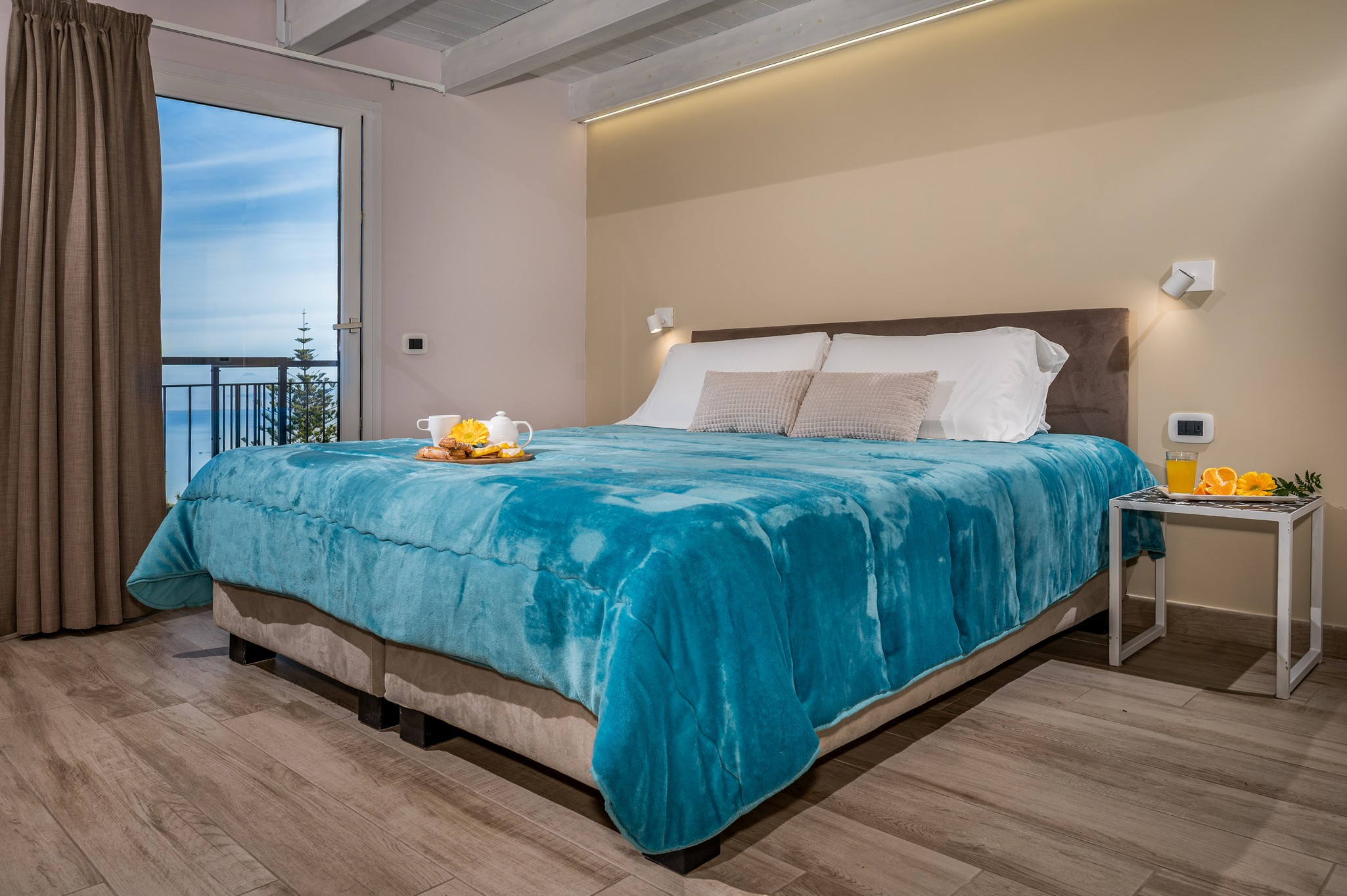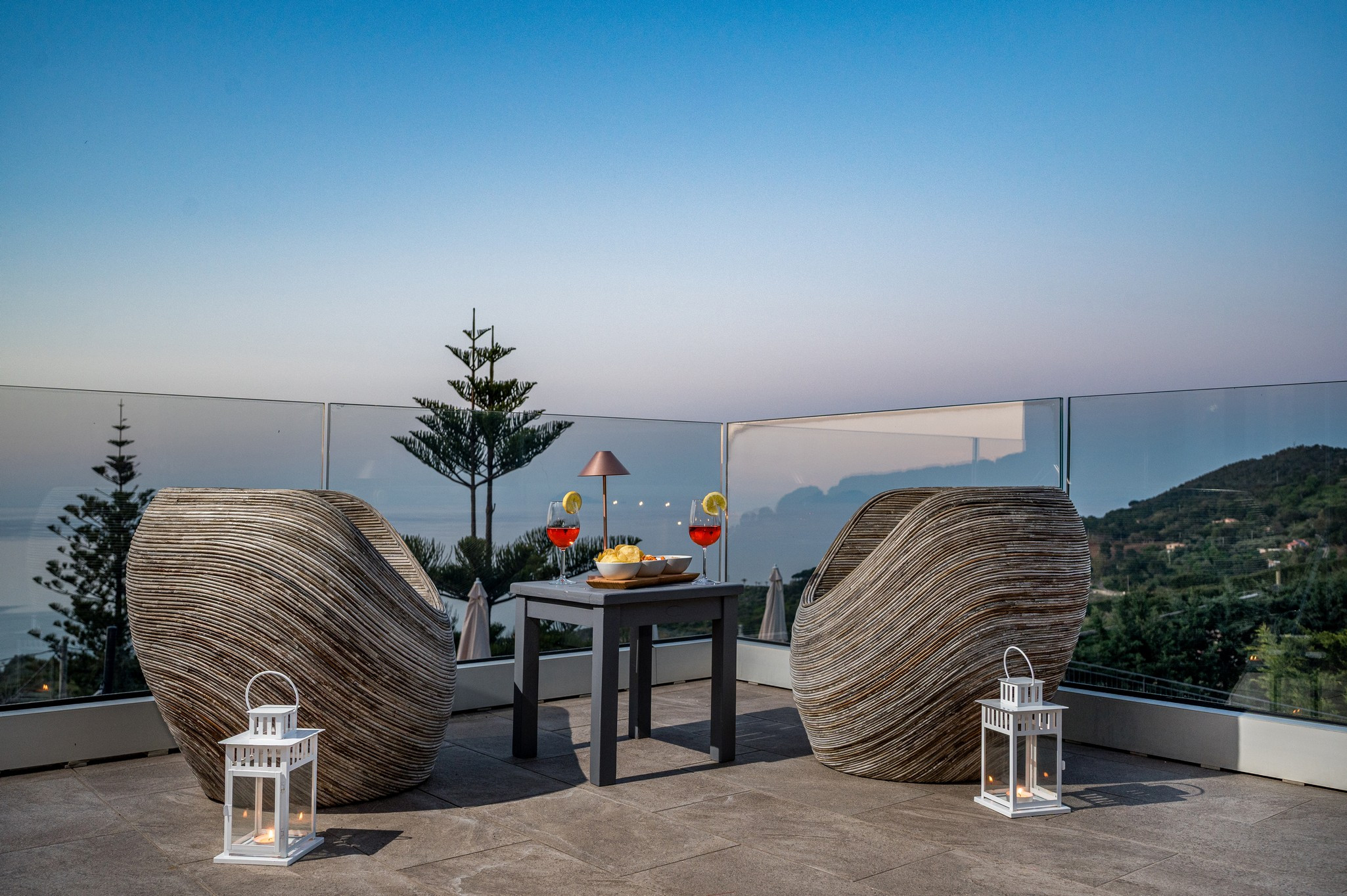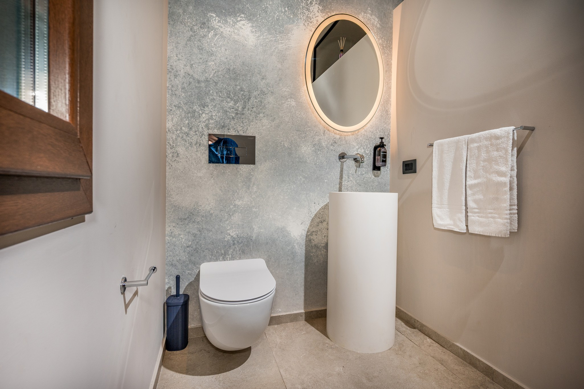 An exterior staircase leads to the newly renovated first floor, offering an airy living space that opens onto a large terrace with panoramic views of the pool, coastline, and Cefalù. This section of the villa has three double bedrooms, two of which feature mezzanines with two single beds, perfect for teenagers. Each bedroom has an en-suite bathroom, and all three double beds can be converted to twins upon request.