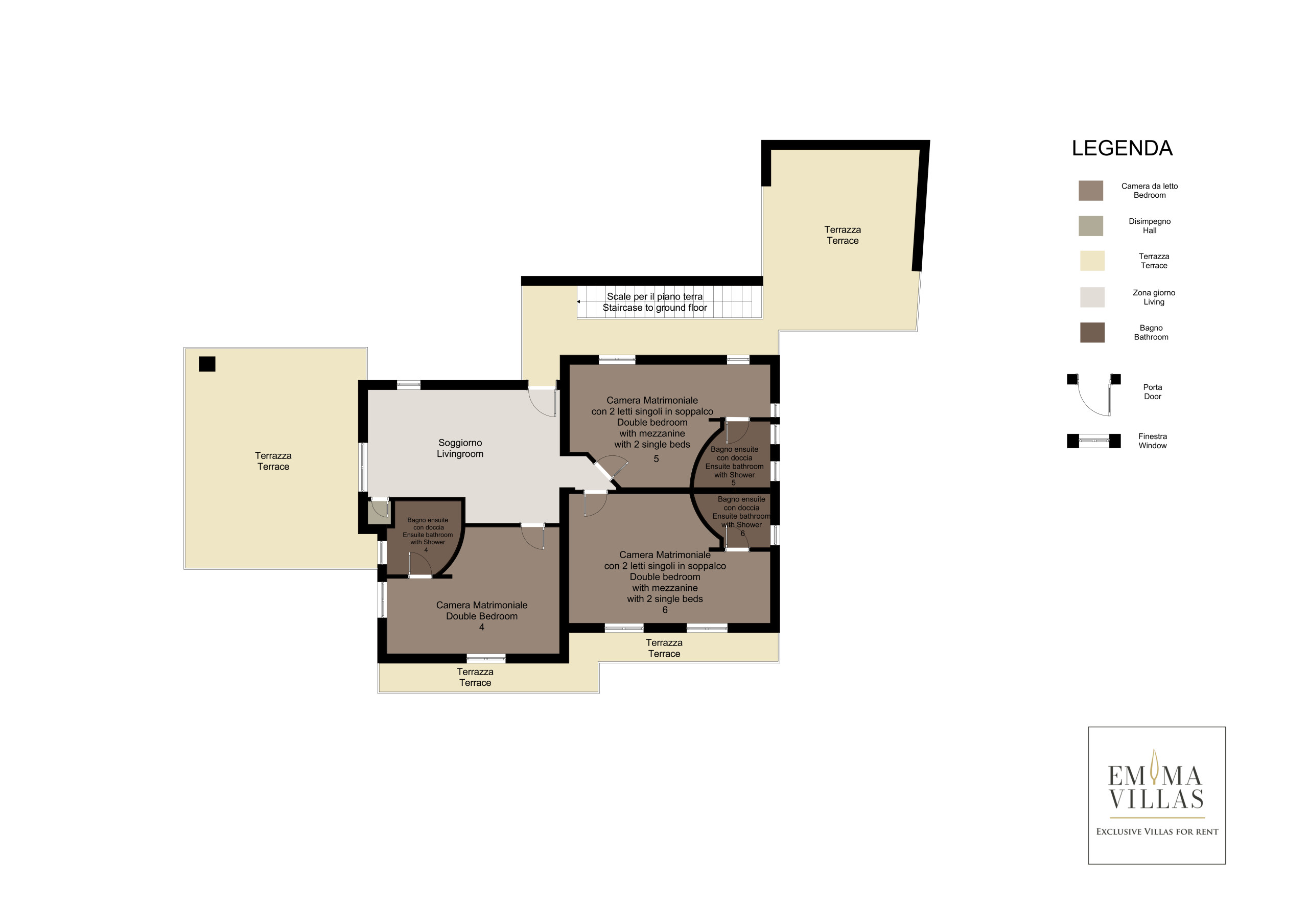 First Floor (Independent Access): Large living area with kitchenette, access to outdoor patio, one double bedroom (king-size bed) with en-suite bathroom, two additional double bedrooms (king-size beds) with en-suite bathrooms and mezzanines with two single beds. Each double bed can be made into twins upon request.