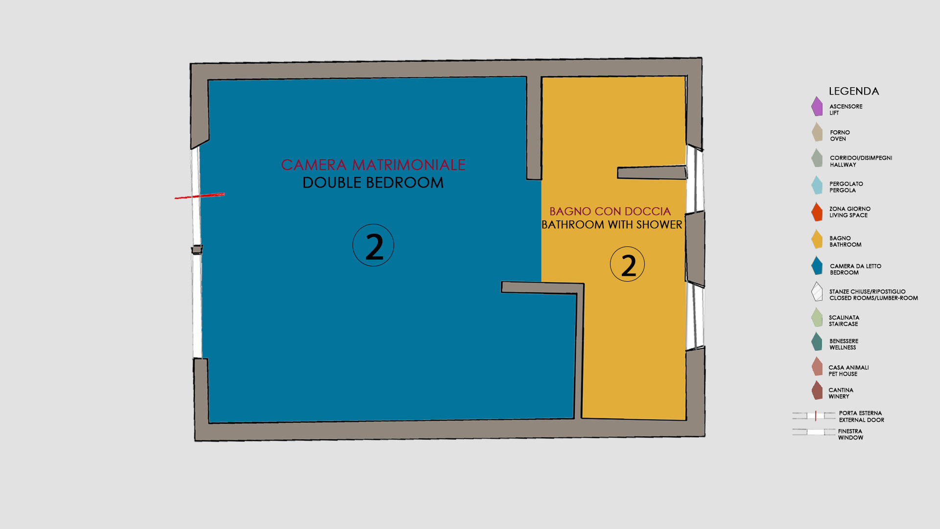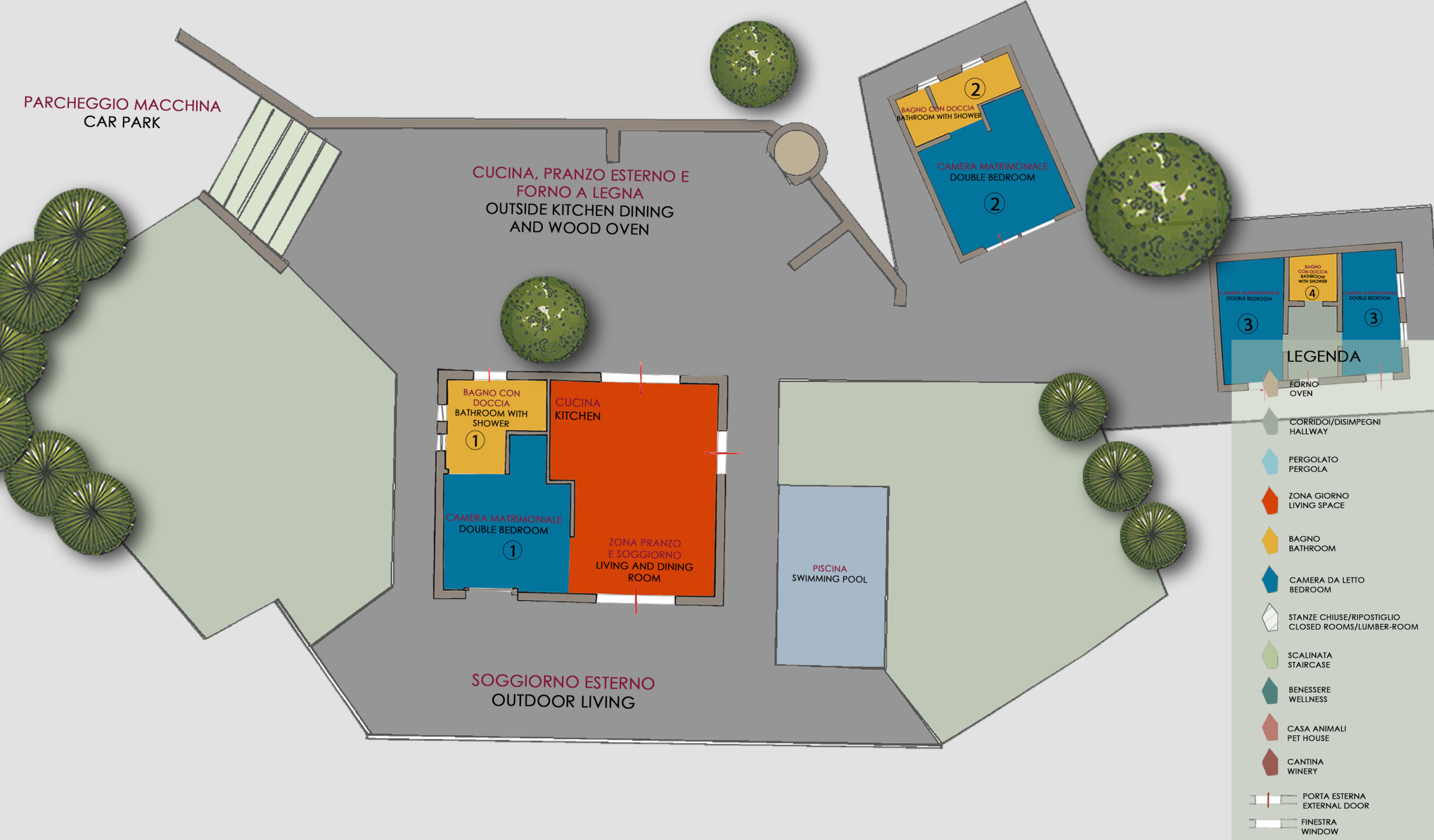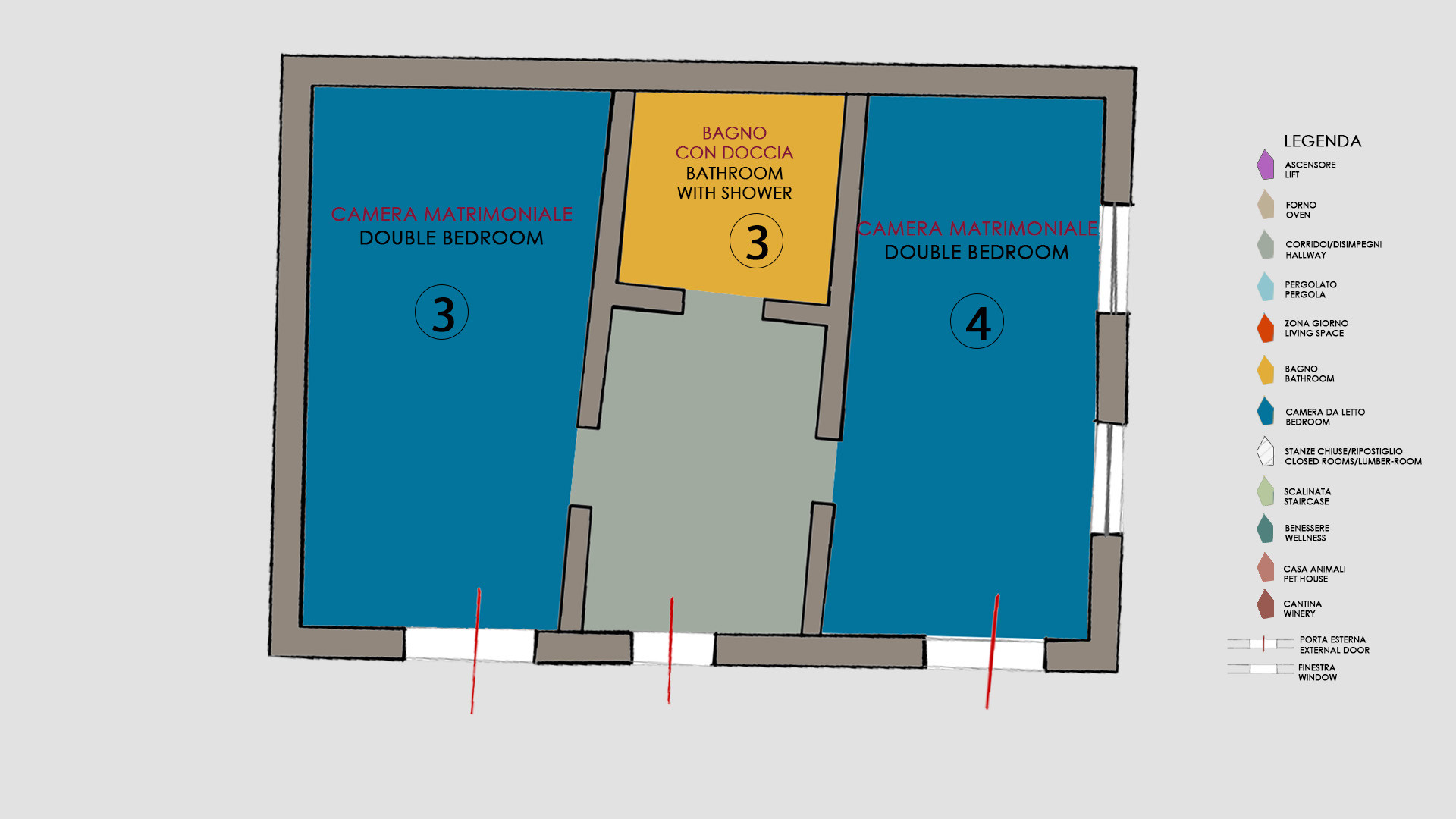 Main House: Open-space living with kitchen and dining for 4 persons, a double bedroom with en-suite bathroom with shower. Annex 1: Double bedroom with en-suite bathroom with shower. Annex 2: Two double bedrooms and a bathroom with shower.