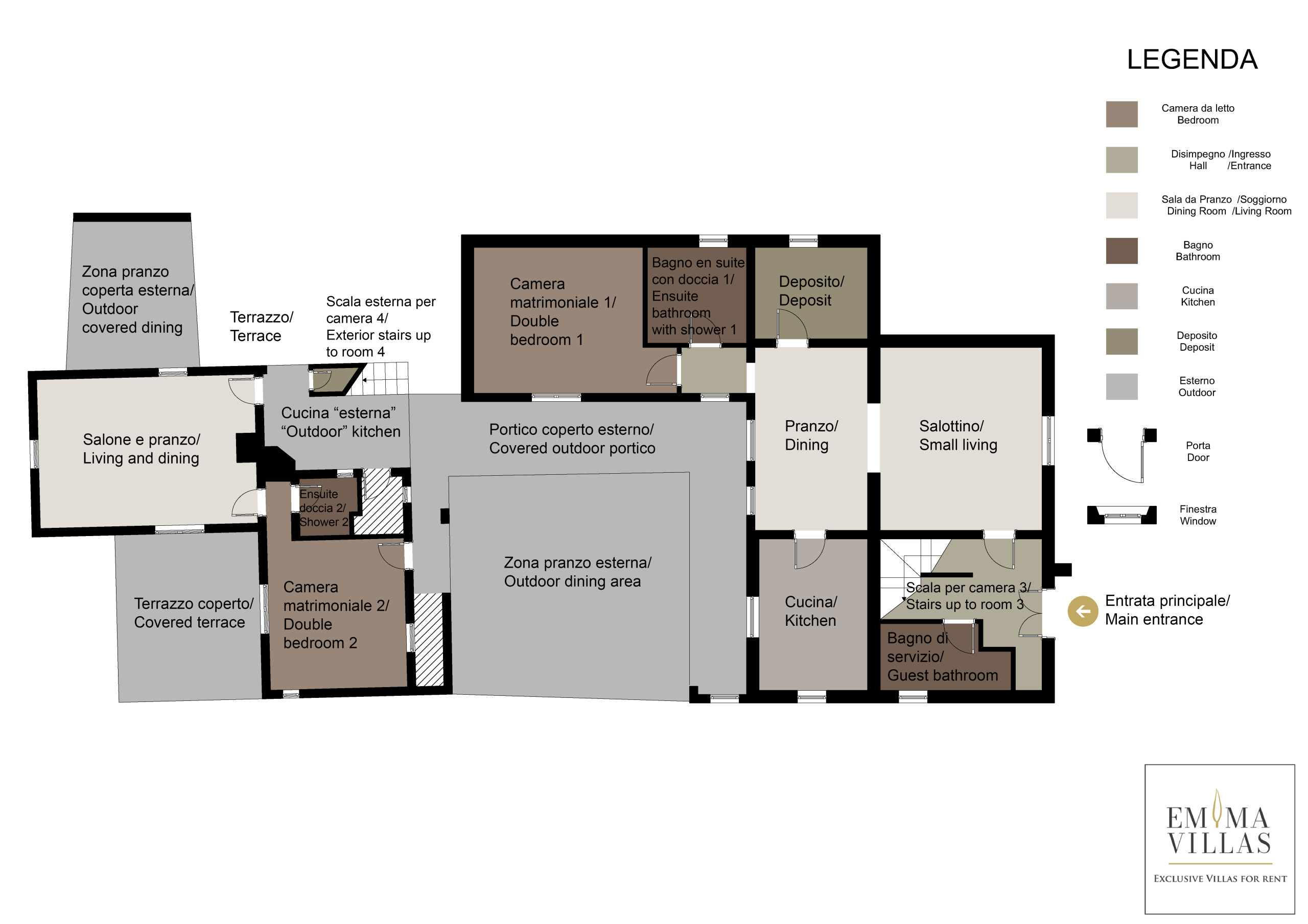 The property is spread over three separate structures, connected by terraces, short paths, and stairways. MAIN VILLA – GROUND FLOOR – It consists of two units that are not internally connected. First Unit: an entrance leads into a cozy sitting room with a fireplace; a fully equipped kitchen opens onto a terrace, perfect for outdoor dining; there is one double bedroom with an en-suite bathroom with shower, and a guest bathroom. Second Unit: this area features one bedroom with an en-suite bathroom with shower, a dining room and kitchen with a wood-fired oven, and a laundry room. FIRST FLOOR: one double bedroom (bed width 1.80 m) with an en-suite bathroom with shower, accessible internally from the ground floor; double bedroom with en-suite bathroom with shower and a private terrace, which is accessed via an external staircase. ANNEX 1 (composed of two floors not internally connected). Ground Floor: this apartment includes a living area with kitchenette, one double bedroom, and a bathroom with shower. First Floor: this apartment offers a sitting area with a fridge, one double bedroom (bed width 1.80 m), and a bathroom with shower. ANNEX 2 (on two floors) - GROUND FLOOR: It features a living room with fireplace, a basic kitchen, one twin bedroom with two 90 cm beds, and a bathroom with shower. FIRST FLOOR: a mezzanine living area and one double bedroom (available as an alternative to the twin bedroom on the ground floor).
