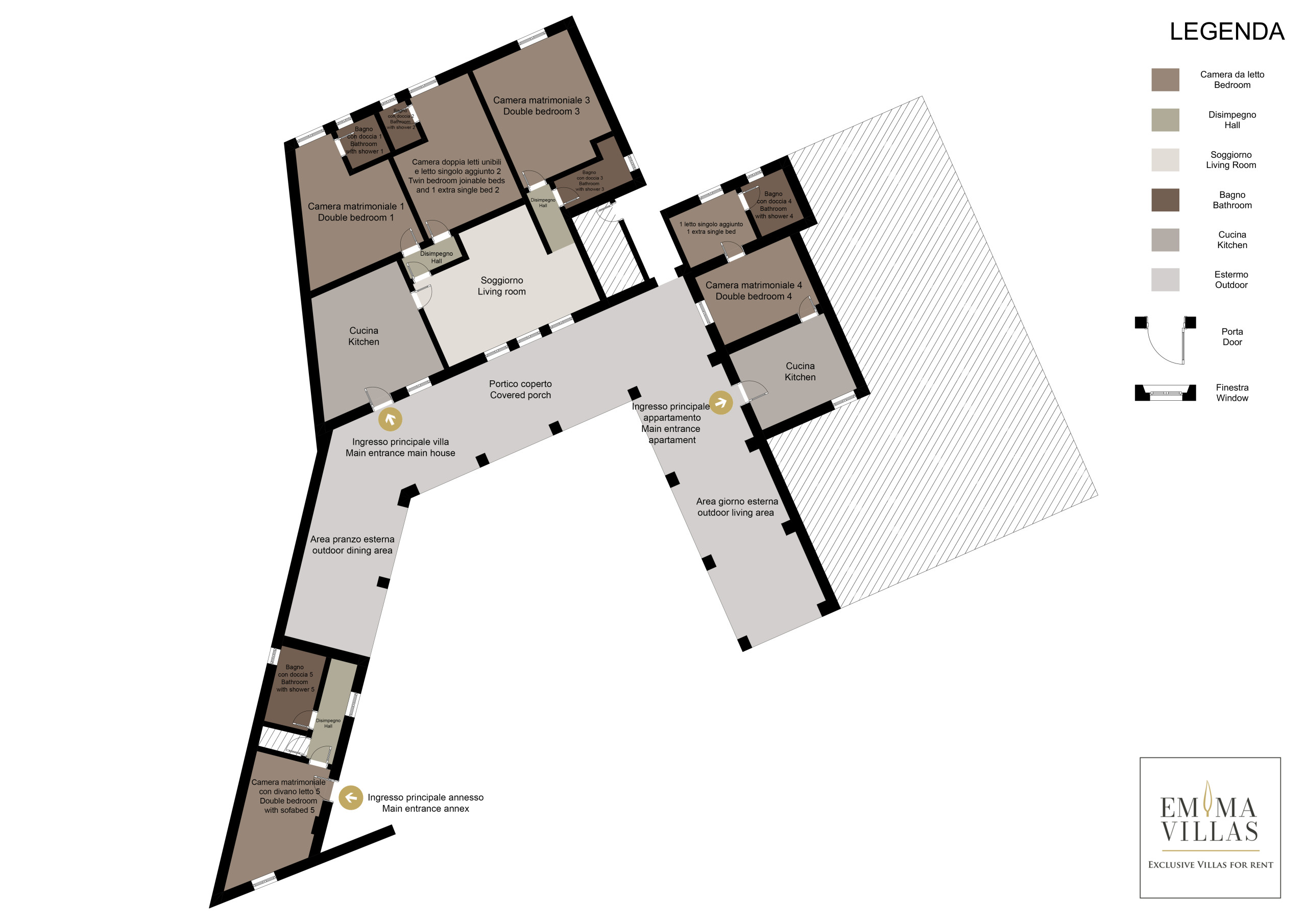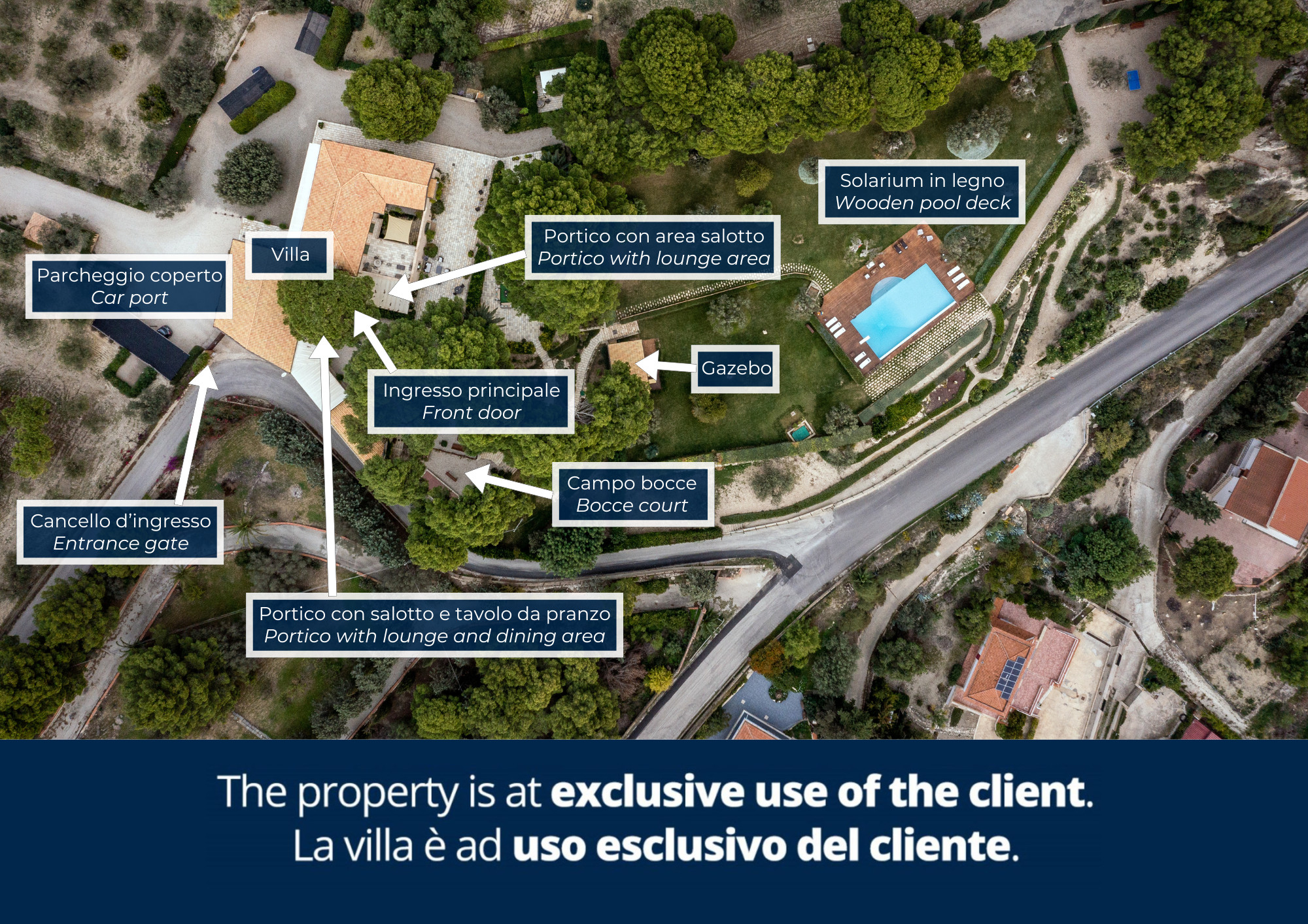 Please notice that photos are taken in spring, therefore flower blossoming, and the colours of the gardens' grass could be different at the moment of your arrival at the villa.