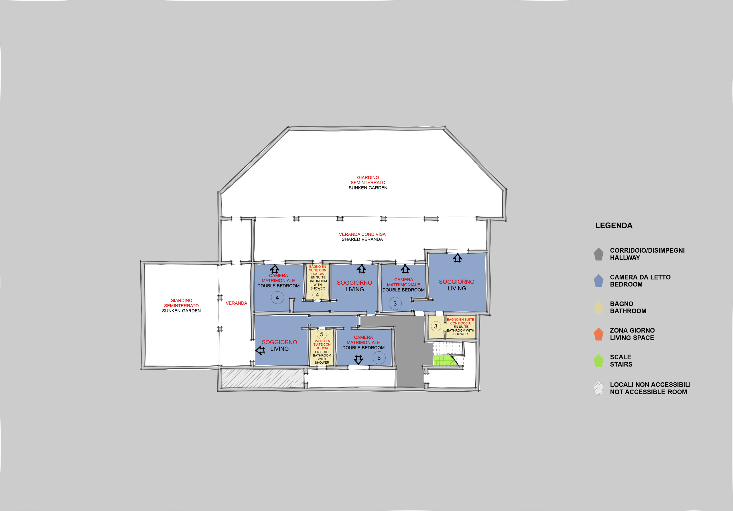 On the lower level: as you move downstairs to follow the large corridors lined with an exuberant display of artworks, you will find three comfortable double suites displaying a delicate blend of considered Italian finishes and the highest quality fixtures and fittings. These suites give onto the arcaded patio with the exclusive view of the sunken garden. All have a private dressing room and a bathroom with shower.