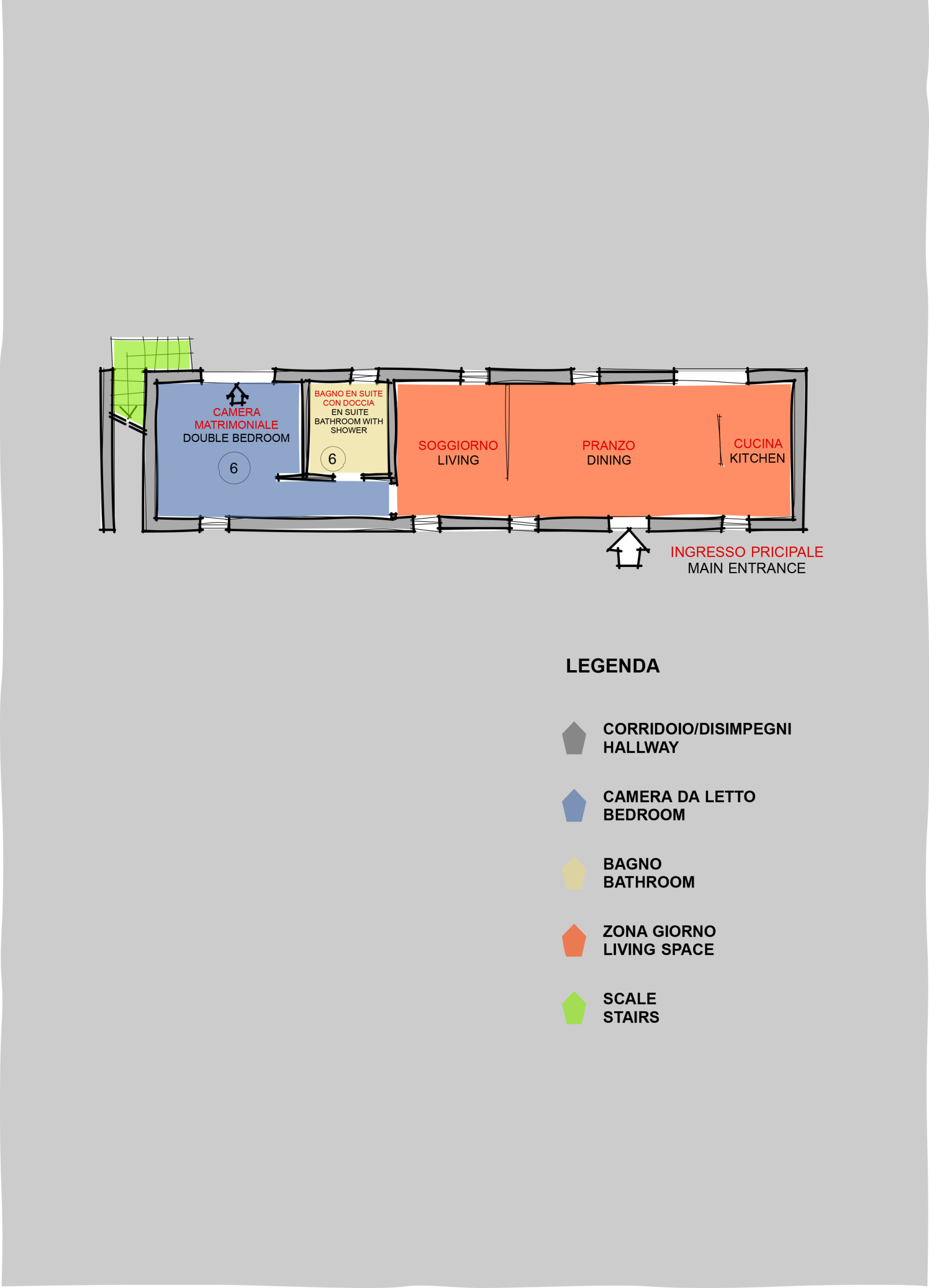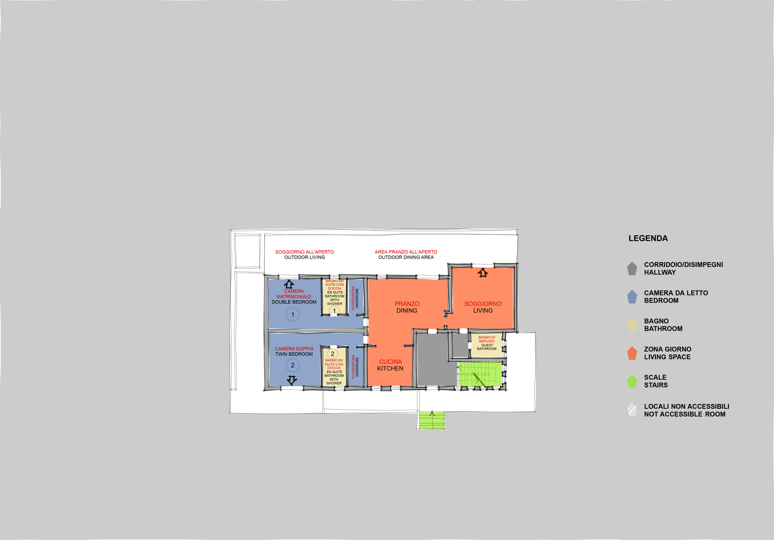 MAIN HOUSE. Ground floor: from the impressive and colorful entrance hall is the main staircase that leads to the roof terrace, or to the en-suite bedrooms below. On one side is a spacious and homely living and on the other, a modern and light dining area with its well-equipped open-style kitchen. Adjacent are two large en-suite bedrooms (one double and one twin with joinable beds) with uninterrupted sea views from the private terrace. The elegant detailing that runs throughout the villa creates a sense of grandeur which is well-matched to the liveliness of the interiors. All these rooms give on to the long belvedere terrace overlooking the vineyards.