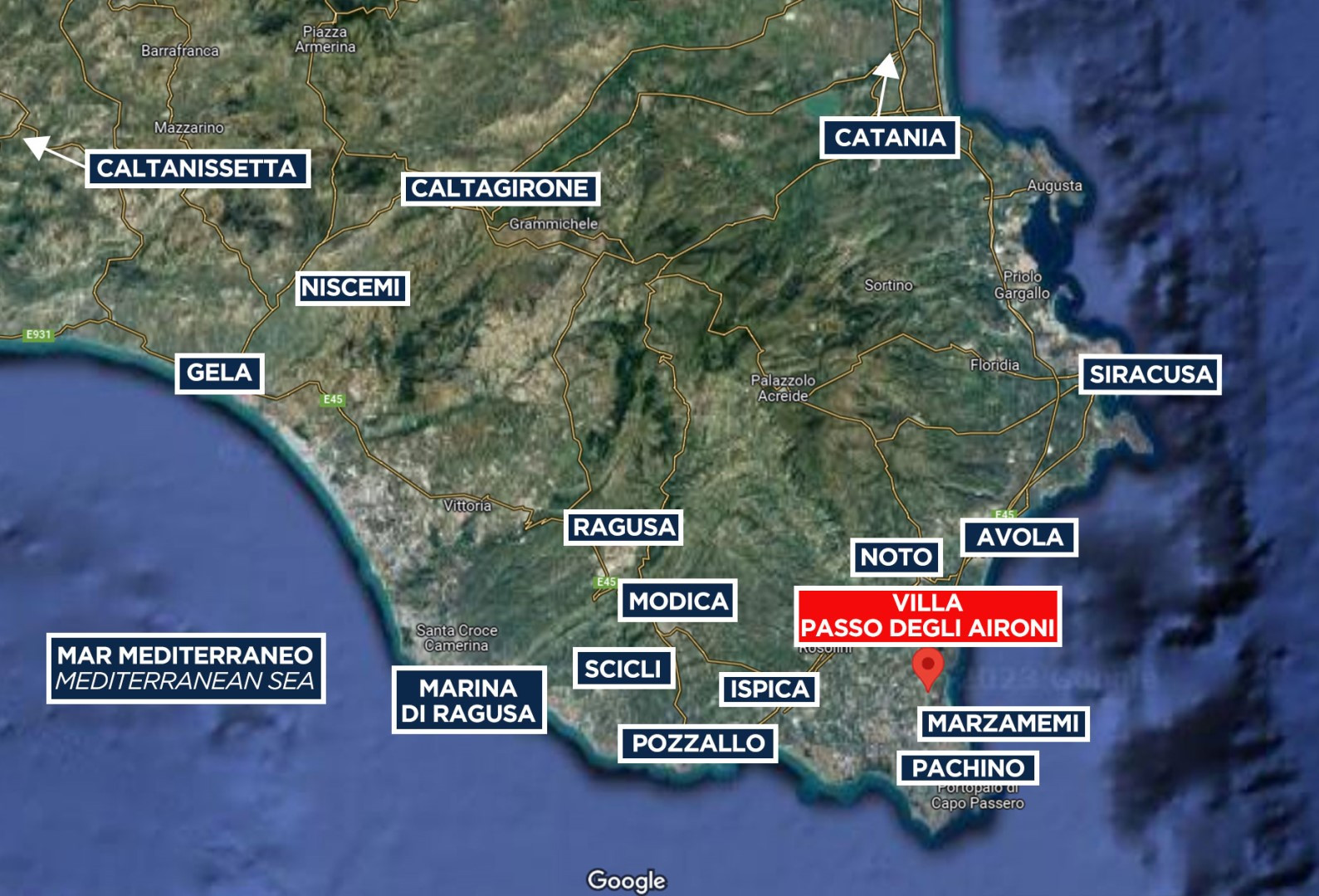 Towns/Services: Pachino (8 km), Marzamemi (10 km), Noto (15 km), Avola (19 km), Rosolini (22 km), Siracusa (45 km)